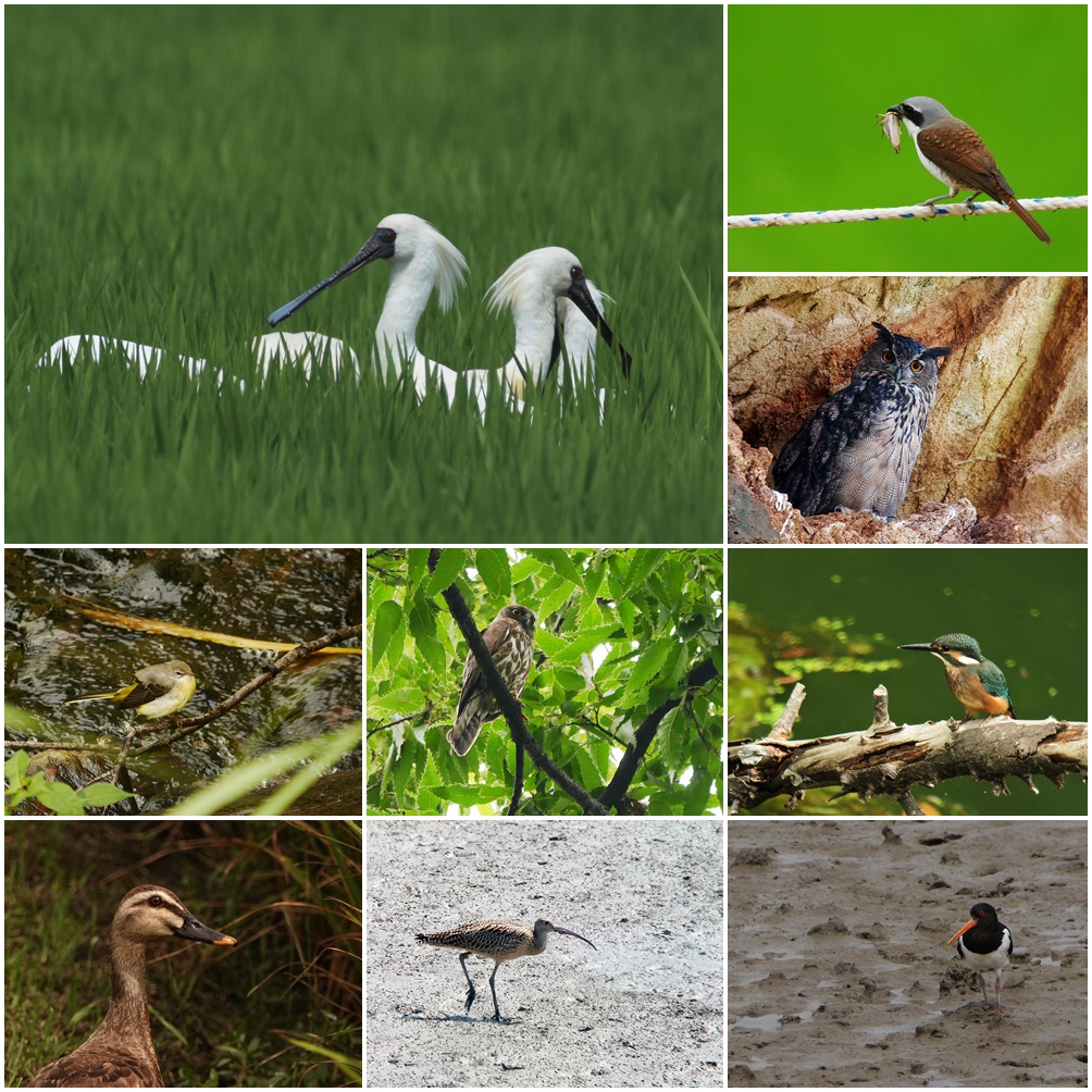 Mandarin Duck Eastern Spot-billed Duck Ring-necked Pheasant Little Grebe Oriental Turtle-Dove Common Cuckoo Eurasian Coot Long-billed Plover Little Ringed Plover Eurasian Oystercatcher Far Eastern Curlew Common Greenshank Black-tailed Gull Great Cormorant Gray Heron Great Egret Intermediate Egret Chinese Egret Little Egret Cattle Egret Striated Heron Black-faced Spoonbill Common Kingfisher Dollarbird Eurasian Kestrel Eurasian Hobby Chinese Sparrowhawk Northern Boobook Pygmy Woodpecker Great Spotted Woodpecker Gray-headed Woodpecker Tiger Shrike Bull-headed Shrike Black-naped Oriole Eurasian Jay Azure-winged Magpie Oriental Magpie Large-billed Crow Barn Swallow Red-rumped Swallow Varied Tit Japanese Tit Long-tailed Tit Eurasian Nuthatch Brown-eared Bulbul Oriental Reed Warbler Eastern Crowned Warbler Vinous-throated Parrotbill Daurian Redstart Gray-backed Thrush White-cheeked Starling Gray Wagtail White Wagtail Yellow-throated Bunting Eurasian Tree Sparrow |